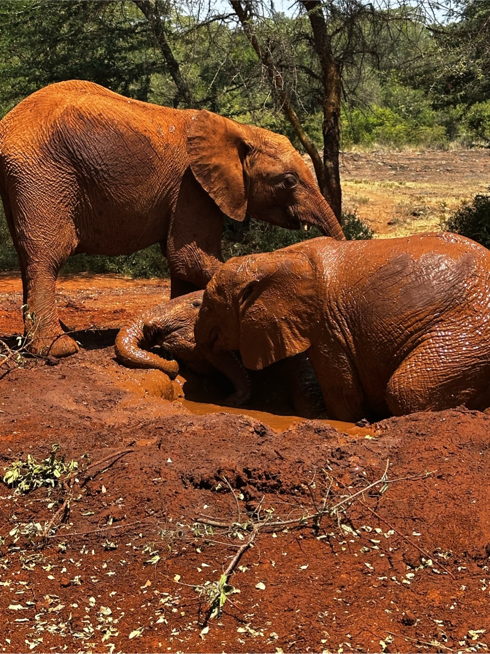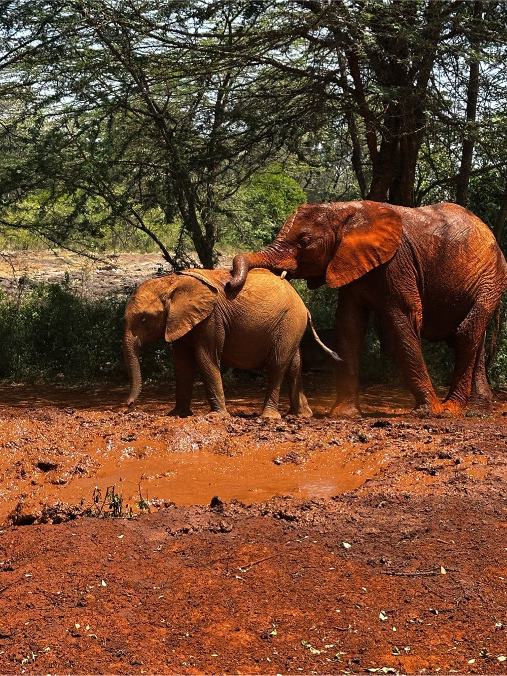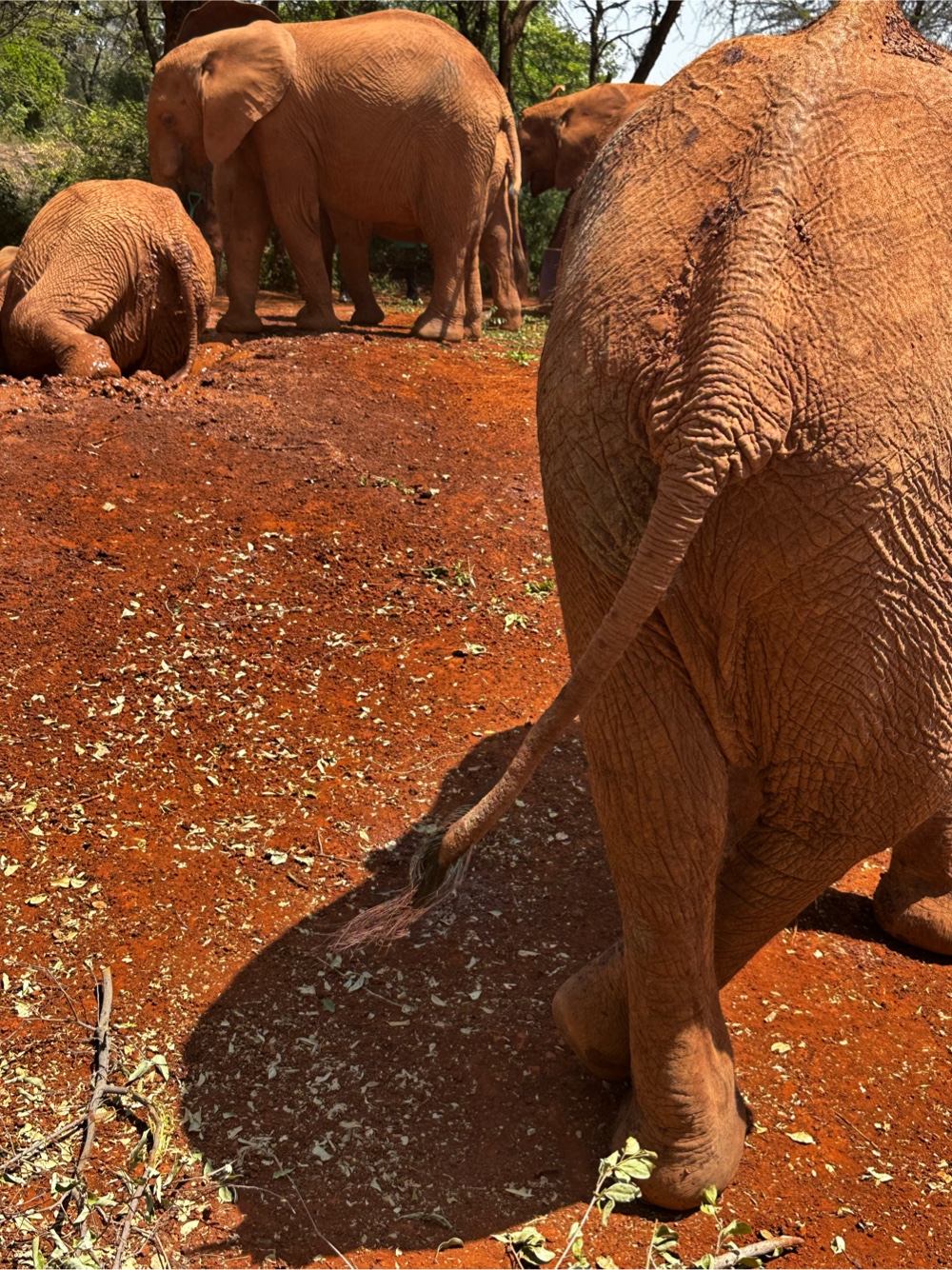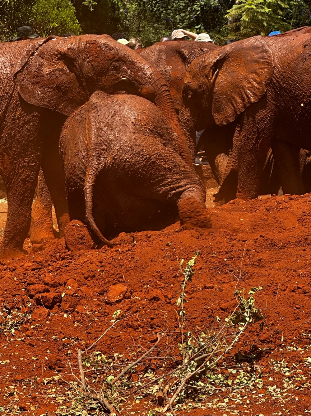 After Tytan and Notty were led out, the elephants came thundering in. It was literally like an elephant preschool - kids fighting, playing, throwing mud, grabbing snacks. They all first went to their bottles of milk which some needed help with and others wrapped their trunks around and slurped it down. Then they started going for the leaves on the ground, picking them up with their trunks. And then finally they started throwing mud on themselves and rolling around in the dirt, pig pile style. They were feisty, cute, and did not care about the spectators. Some came close enough to pet, others paid no mind and went right to the mud pit. The visit was a very short hour but so cute, and then we headed back to our uber to go meet the driver for our next adventure - Giraffe Manor!