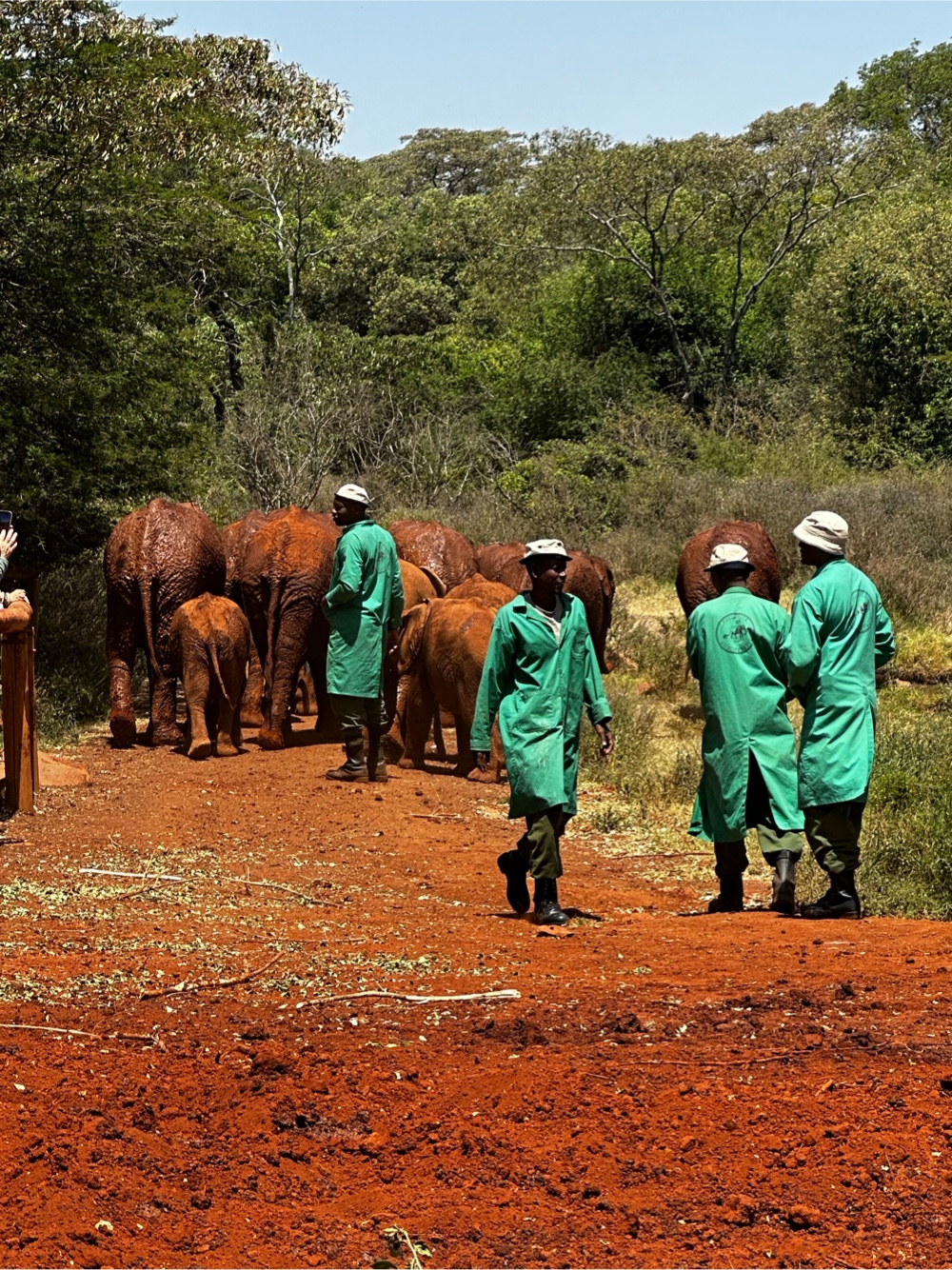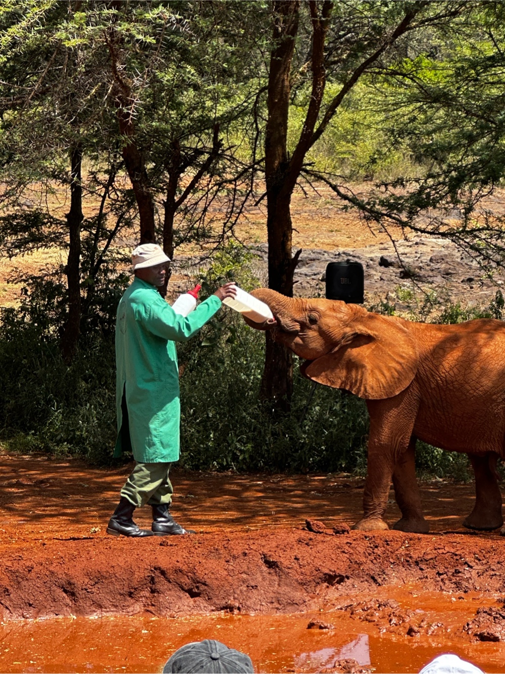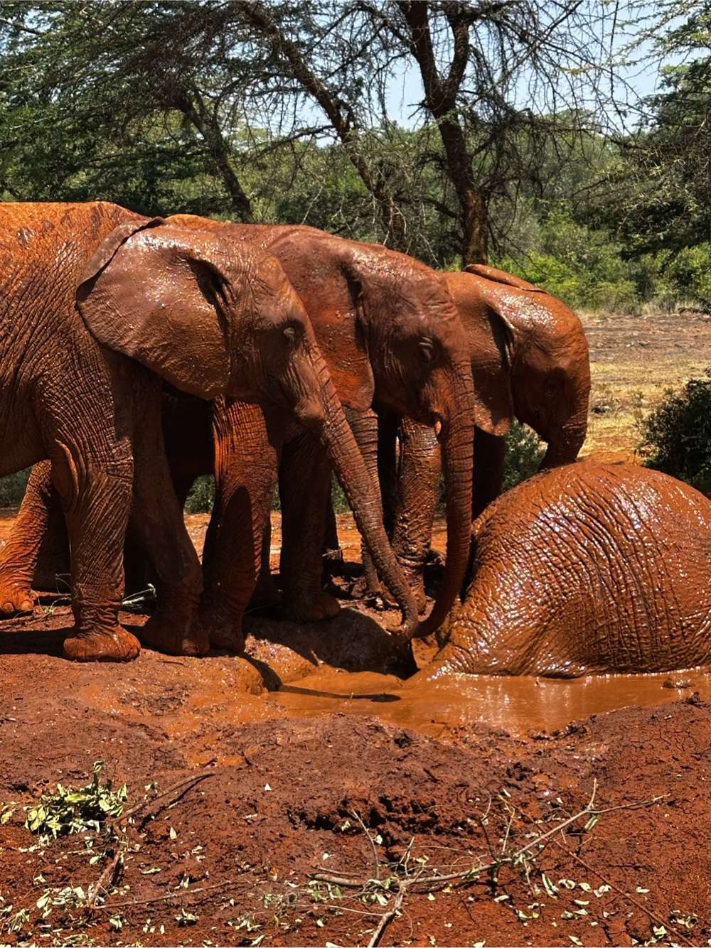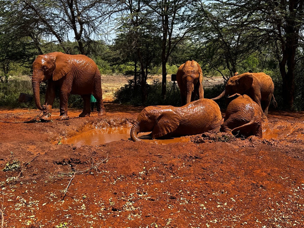 After Tytan and Notty were led out, the elephants came thundering in. It was literally like an elephant preschool - kids fighting, playing, throwing mud, grabbing snacks. They all first went to their bottles of milk which some needed help with and others wrapped their trunks around and slurped it down. Then they started going for the leaves on the ground, picking them up with their trunks. And then finally they started throwing mud on themselves and rolling around in the dirt, pig pile style. They were feisty, cute, and did not care about the spectators. Some came close enough to pet, others paid no mind and went right to the mud pit. The visit was a very short hour but so cute, and then we headed back to our uber to go meet the driver for our next adventure - Giraffe Manor!