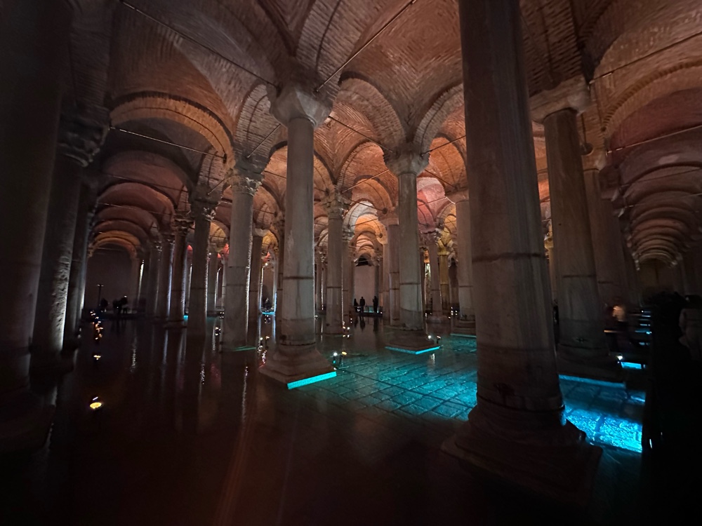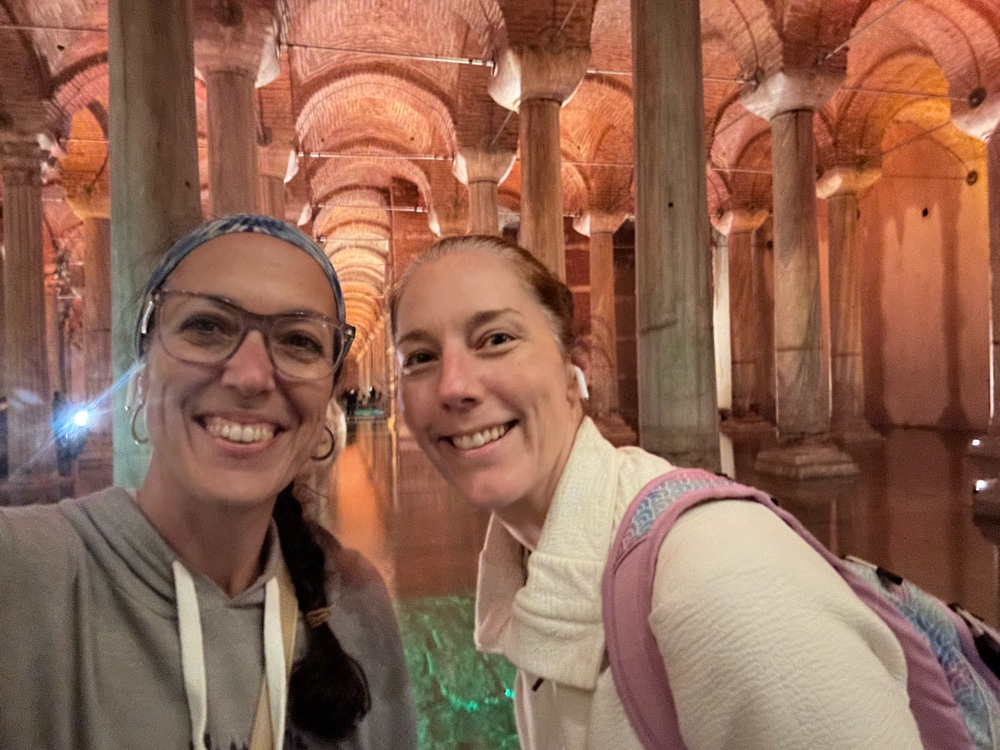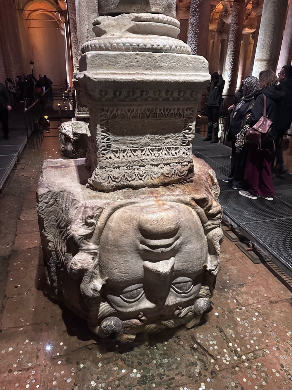 From the bazaar we headed to one of the coolest spots of the trip- the Basilica Cistern. This is an underground water storage facility that was used to provide clean water to the city. The water was 7-9 meters deep and they kept fish in the water to make sure it wasn’t poisoned. This was such a cool space because to build it they used columns from other Roman structures. So it was adaptive reuse of sorts. It was cool to see all the different column capitals. You don’t notice at first. The venue now contains some dramatically lit art as well. There are two column capitals that are used as bases in the cistern that are faces of Medusa. They are rumored to be placed upside down or sideways so that the workers building the cistern don’t turn to stone.