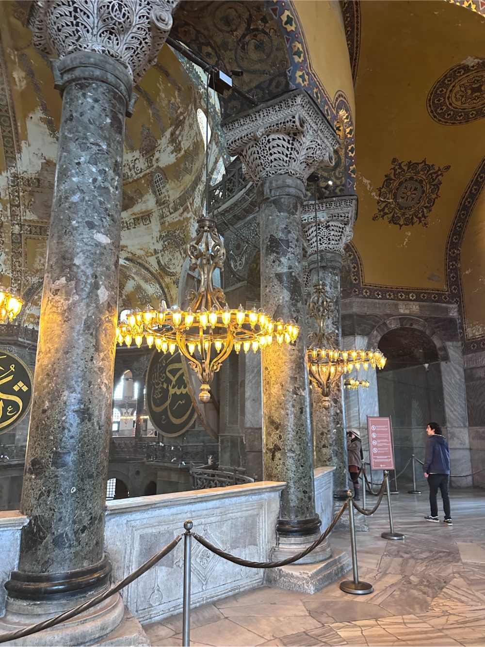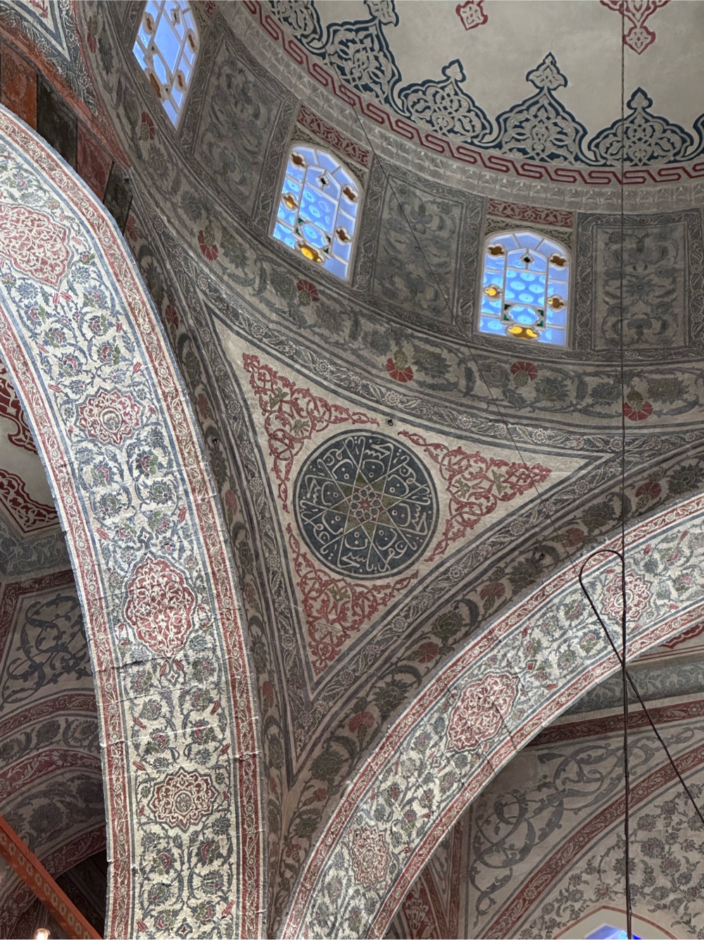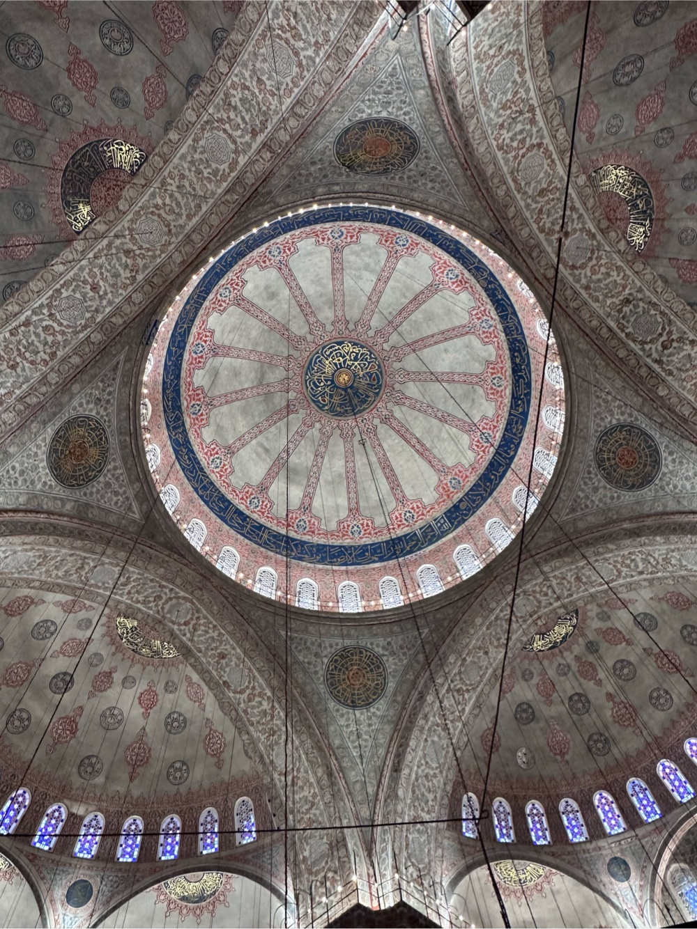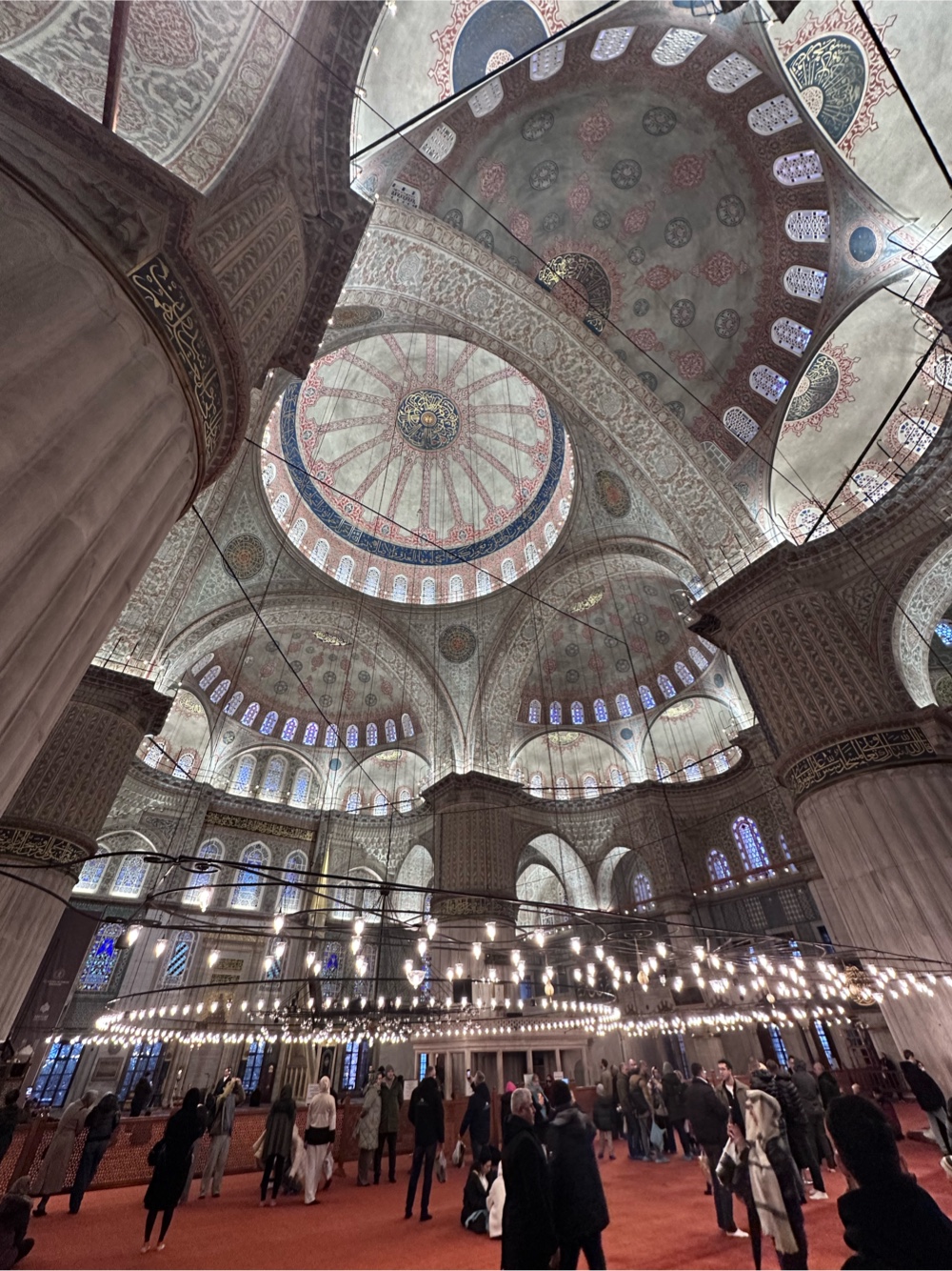 Number one on my list was to see Hagia Sophia, because I had studied it in architecture school and it has such a long history. So we got a guided tour to make sure I could ask all my questions. Not sure I would do that again actually, but it was very cool to see. The first church built on the site was built in 360AD as a Christian church by Constantine. It burned down and the there was another church built there in the 6th Century and that one was demolished in riots because the people who lived there were unhappy with the government. Then the third church built was Hagia Sophia. It was built by emperor Justinian and also was built in an epic 5 years using volunteer labor. The reason it was able to be built so quickly was because it, like the cistern, used columns and materials from other Roman buildings like the temple of Artemis from Ephesus, so you can call this another sort of adaptive reuse as well. It was used as a Christian church until the Middle Ages when the Ottoman Turks converted it to a mosque, covered the mosaic floor with carpet, and removed or covered any of the Christian iconography. Then in 1932 it was converted to a museum, the floor was uncovered, it was heavily restored by some folks from NY who uncovered a few beautiful gold mosaics from the 12th century, and it was opened to the public. Unfortunately in 2020 during covid it was converted back to a mosque which was a controversial move by the president (insert more shady business here) and so now the ground floor is only open for prayer. We were able to tour the upstairs gallery which was still cool but it’s a shame, because there aren’t even a lot of people who pray here (it is rumored that they are politicians), and there are so many other mosques including the blue mosque right next door. Also there was huge scaffolding covering the dome, and it will be there for at least 10 years! There was a huge earthquake in Istanbul in 1999 that did some damage to the structure but they are doing more cosmetic upgrades too. Side note, I definitely would not want to be in Istanbul for a 7.8 magnitude earthquake!