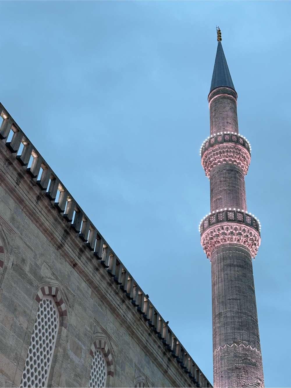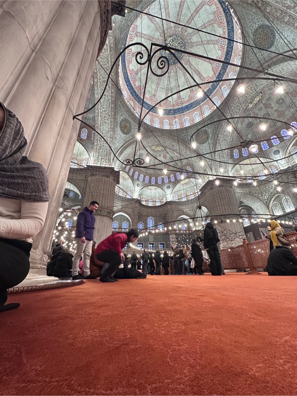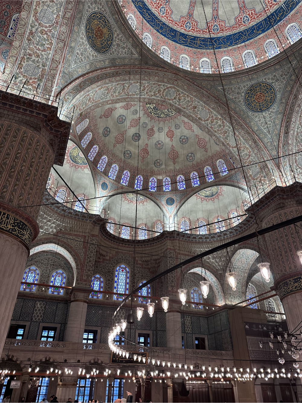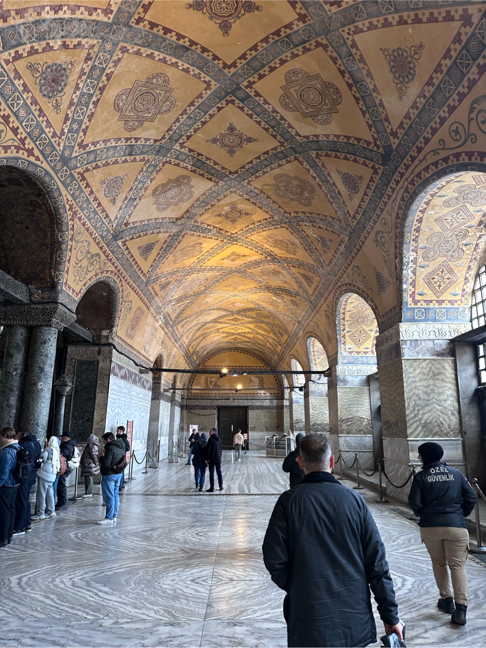 Number one on my list was to see Hagia Sophia, because I had studied it in architecture school and it has such a long history. So we got a guided tour to make sure I could ask all my questions. Not sure I would do that again actually, but it was very cool to see. The first church built on the site was built in 360AD as a Christian church by Constantine. It burned down and the there was another church built there in the 6th Century and that one was demolished in riots because the people who lived there were unhappy with the government. Then the third church built was Hagia Sophia. It was built by emperor Justinian and also was built in an epic 5 years using volunteer labor. The reason it was able to be built so quickly was because it, like the cistern, used columns and materials from other Roman buildings like the temple of Artemis from Ephesus, so you can call this another sort of adaptive reuse as well. It was used as a Christian church until the Middle Ages when the Ottoman Turks converted it to a mosque, covered the mosaic floor with carpet, and removed or covered any of the Christian iconography. Then in 1932 it was converted to a museum, the floor was uncovered, it was heavily restored by some folks from NY who uncovered a few beautiful gold mosaics from the 12th century, and it was opened to the public. Unfortunately in 2020 during covid it was converted back to a mosque which was a controversial move by the president (insert more shady business here) and so now the ground floor is only open for prayer. We were able to tour the upstairs gallery which was still cool but it’s a shame, because there aren’t even a lot of people who pray here (it is rumored that they are politicians), and there are so many other mosques including the blue mosque right next door. Also there was huge scaffolding covering the dome, and it will be there for at least 10 years! There was a huge earthquake in Istanbul in 1999 that did some damage to the structure but they are doing more cosmetic upgrades too. Side note, I definitely would not want to be in Istanbul for a 7.8 magnitude earthquake!